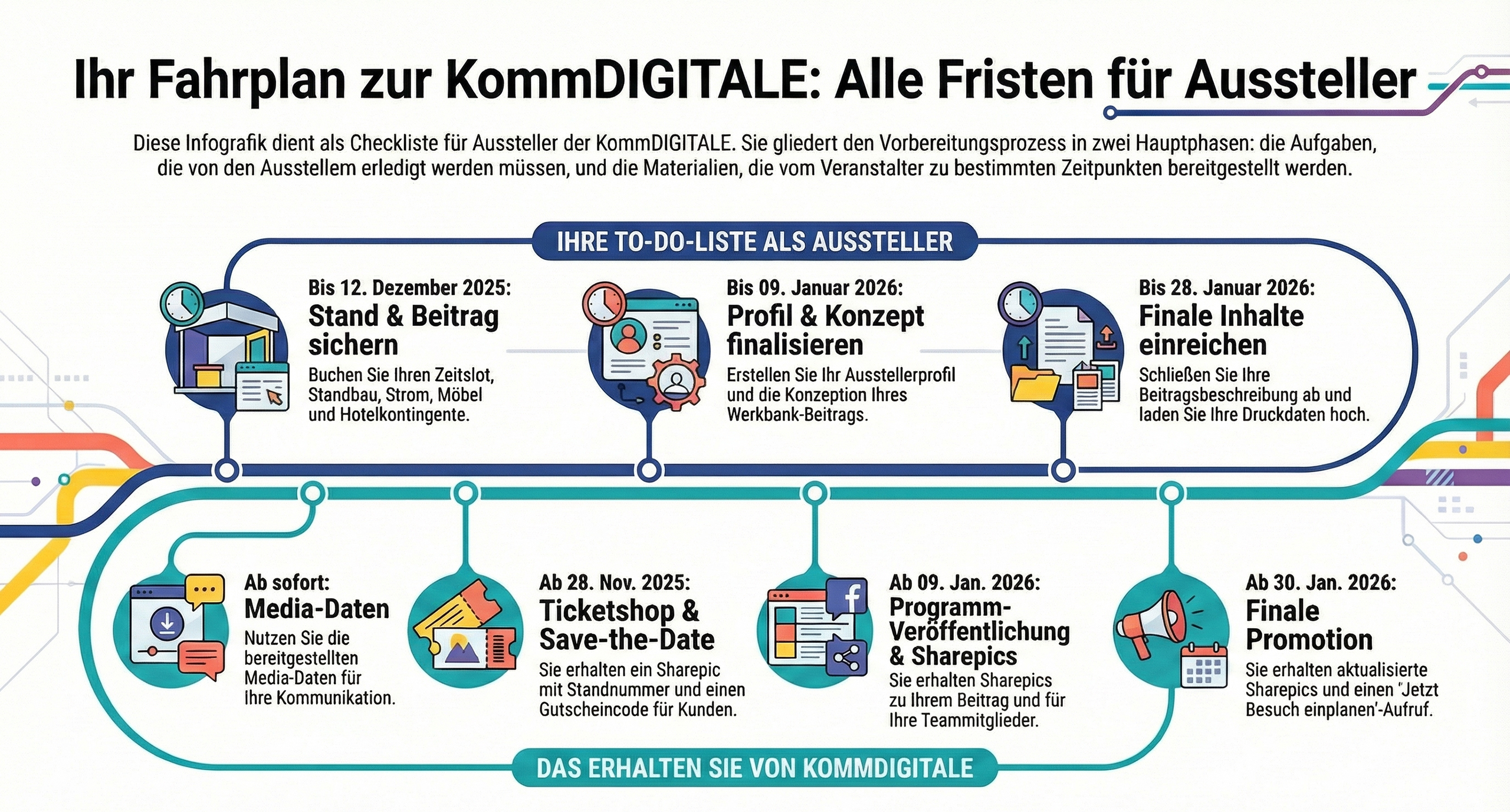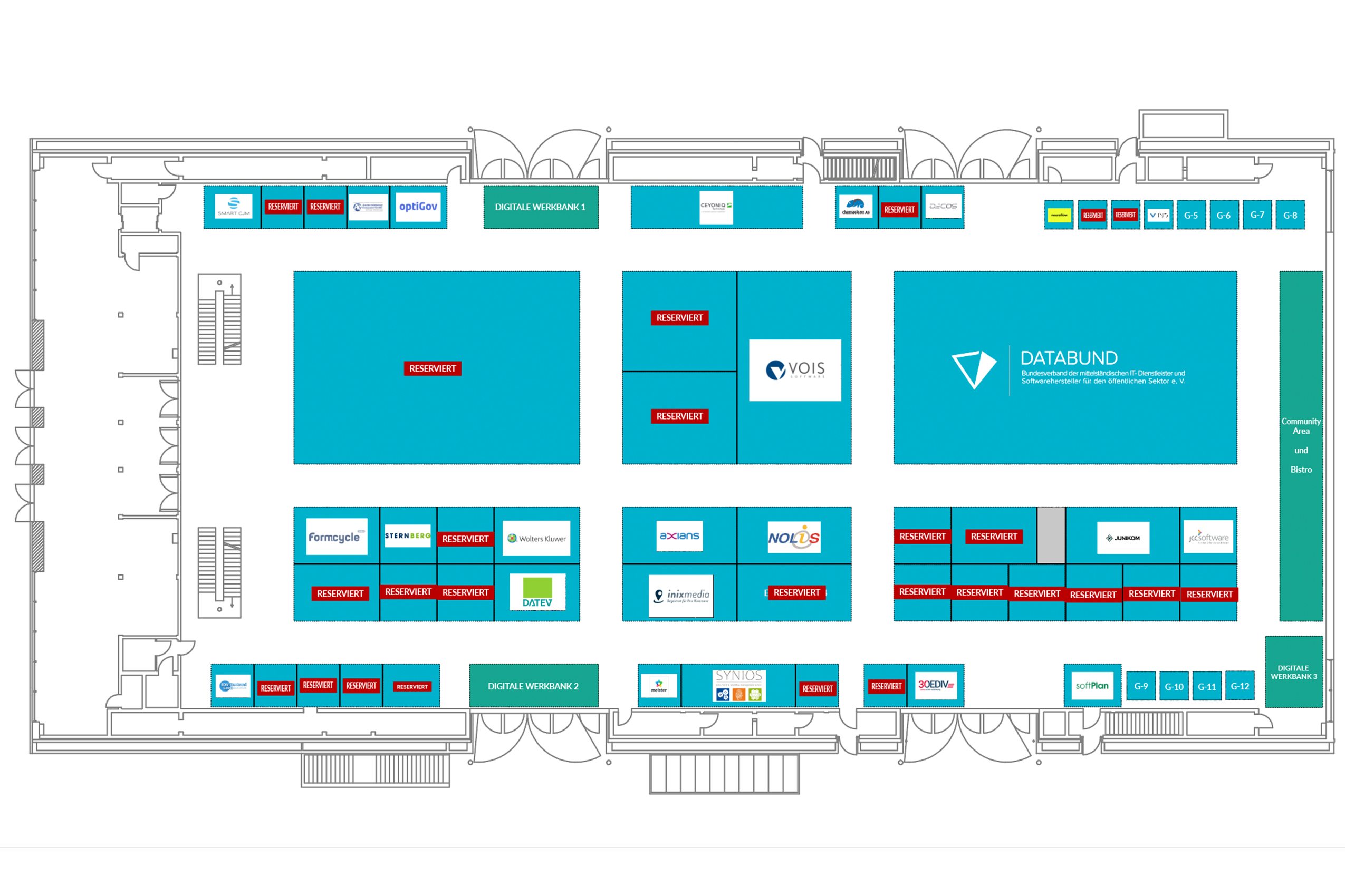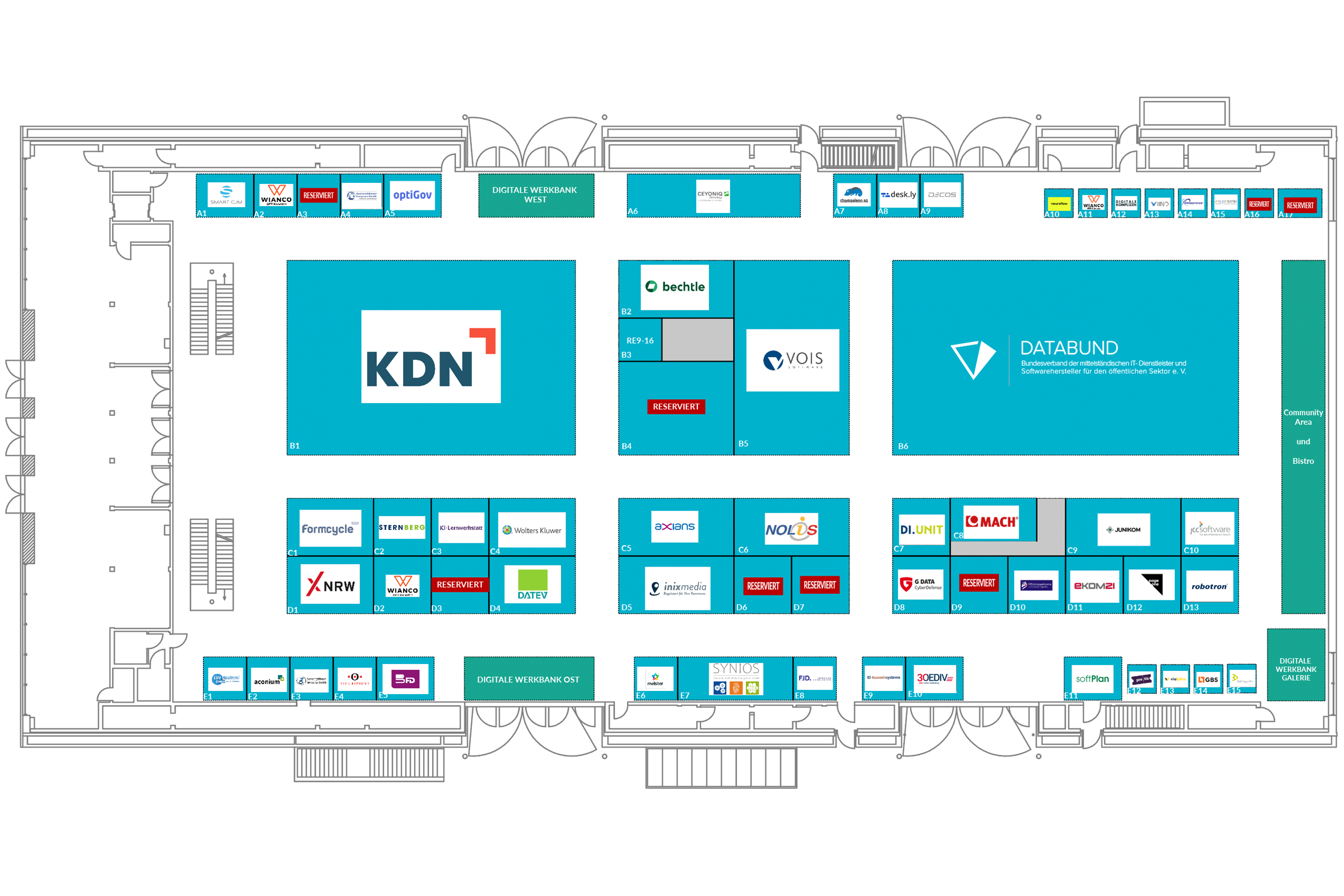 Nach den Erfahrungen der vergangenen KommDIGITALE 2022 und 2024 haben wir das Hallenraster weiterentwickelt. Es führt die Besuchenden nun ideal durch die Messe und schafft Raum für unsere neuen Pakete.
