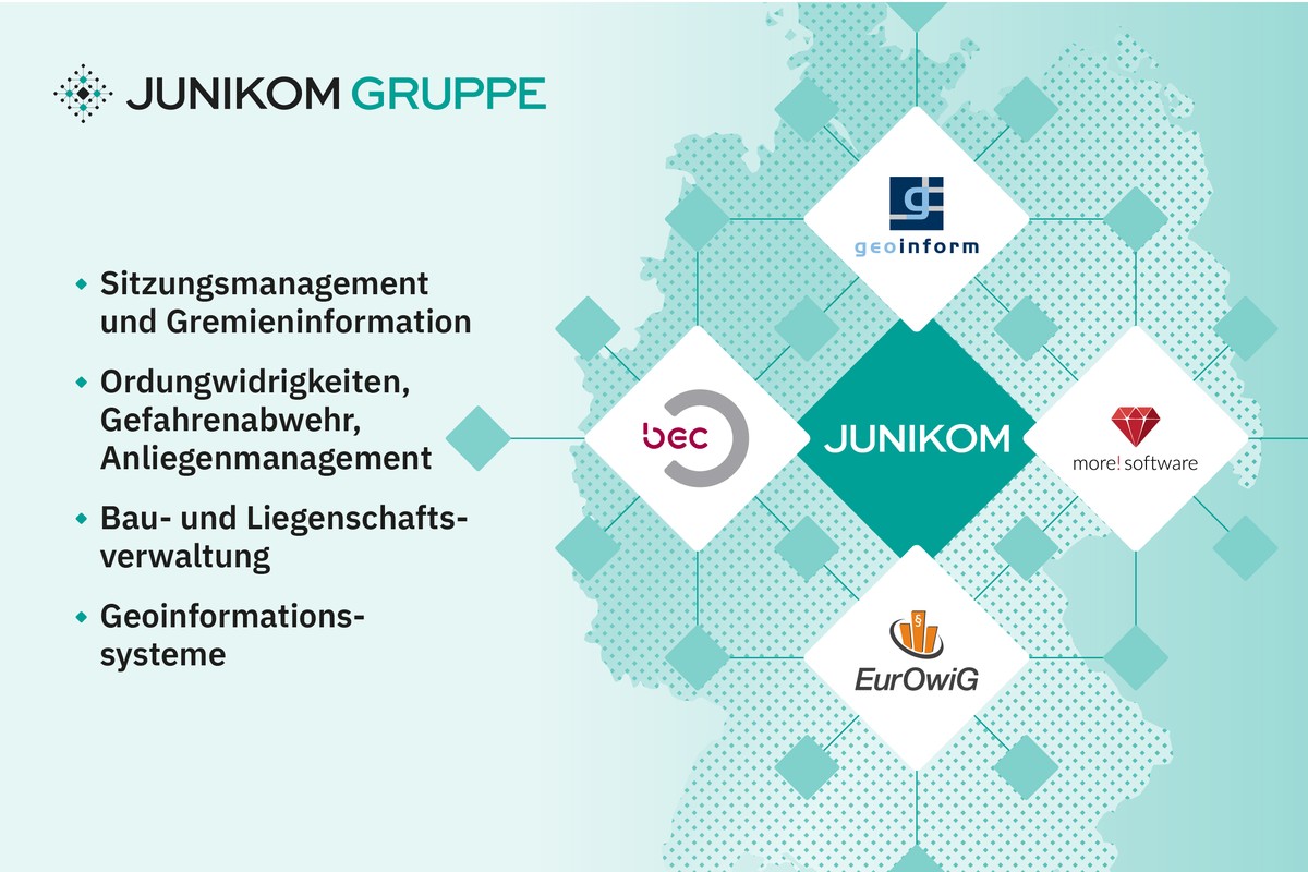 Die Junikom Gruppe GmbH vereint führende Softwarespezialisten für die kommunale Verwaltung unter einem Dach. Mit den mittelständischen Unternehmen bec kommunal, geoinform, EurOwiG und more! software bündeln wir jahrzehntelange Fachkompetenz in folgenden Leistungsbereichen:
