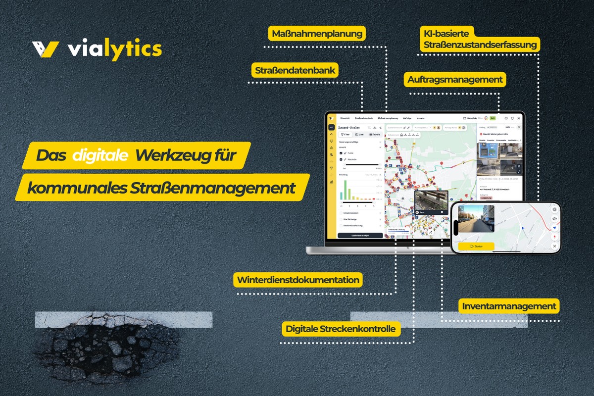 Entdecken Sie mit vialytics die effiziente Lösung für digitales Straßenmanagement. Unsere Software erfasst Zustände automatisch per Smartphone, unterstützt Sie bei der Planung und bündelt alle Wartungsaufgaben in einem System.
