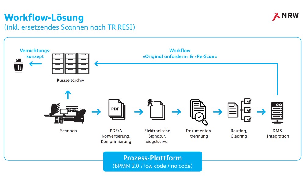 Die modulare Softwarearchitektur erlaubt es, ersetzend zu scannen gem. TR RESISCAN. Die vom Scanner erzeugten Bilder werden in PDF-Dateien umgewandelt, nach der Stichprobenprüfung signiert, mit einem Transfervermerk versehen und über das Routing / Clearing in die eAkte (DMS) übergeben. Optional erweiterbar mit Modulen für Dokumentenerkennung, -trennung.