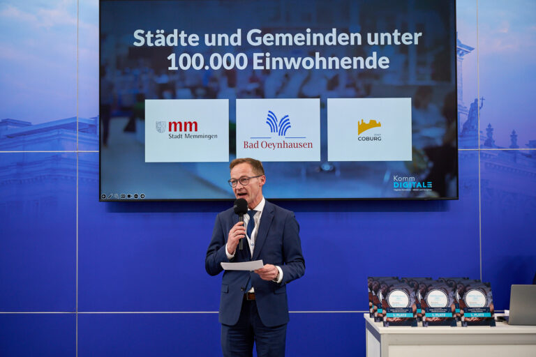 Ein besonderer Höhepunkt war erneut der DIGITAL-Award, den die KommDIGITALE gemeinsam mit der KOMMUNALE in Nürnberg im jährlichen Wechsel verleiht. Neun Projekte wurden in drei Kategorien ausgezeichnet. Die prämierten Best-Practice-Beispiele zeigten eindrucksvoll, wie vielfältig und wirksam digitale Verwaltungsmodernisierung heute umgesetzt wird – von kleineren Kommunen über Großstädte bis hin zu länderübergreifenden Kooperationsprojekten. Bereits am ersten Messetag stellten die Finalisten ihre Projekte auf der Bühne vor, bevor sie am Abend im Rahmen der Preisverleihung ausgezeichnet wurden.