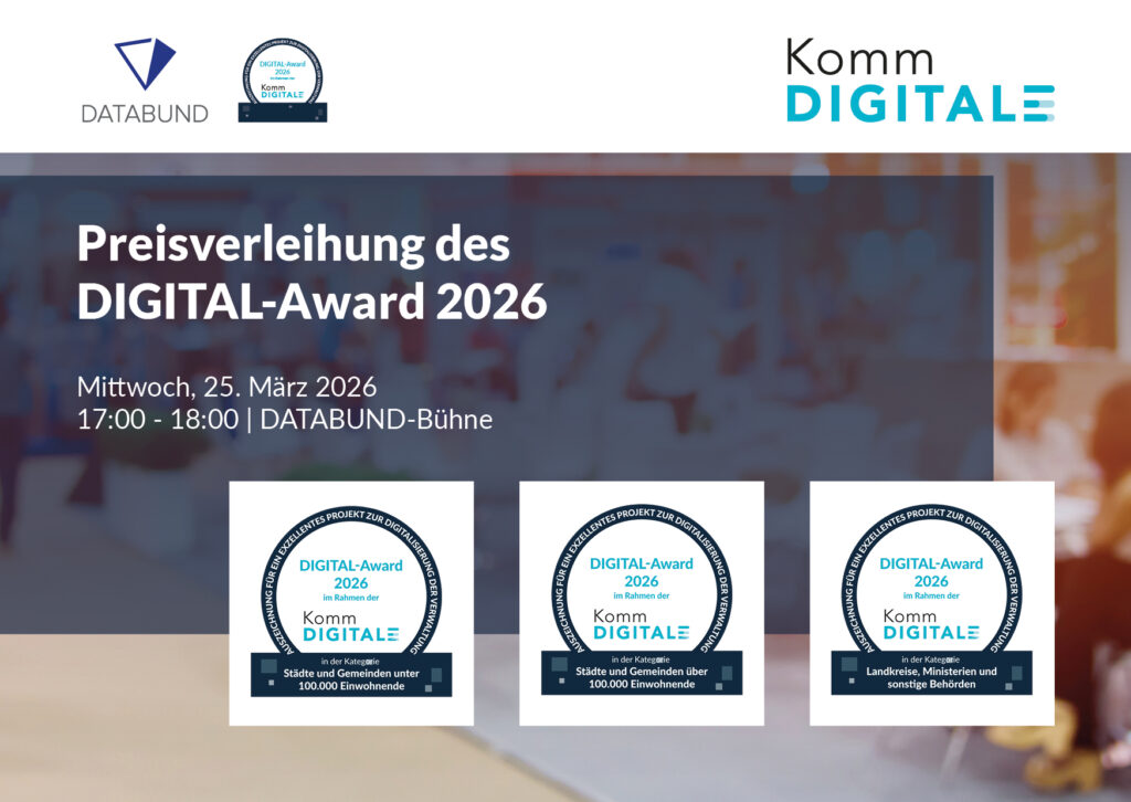 Der DIGITAL-Award der KommDIGITALE macht innovative Digitalprojekte aus der öffentlichen Verwaltung sichtbar. Auch 2026 zeichnet die Veranstaltung wieder Projekte aus, die zeigen, wie Verwaltungsdigitalisierung erfolgreich umgesetzt werden kann.