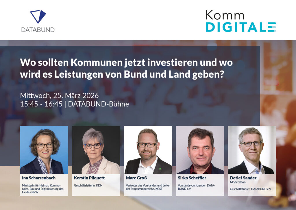 Am 25. und 26. März 2026 kommen in der Stadthalle Bielefeld kommunale Entscheidungsträgerinnen und Entscheidungsträger, Verwaltungs- und IT-Expertinnen und -Experten sowie Lösungsanbieter zusammen, um Erfahrungen auszutauschen und konkrete Lösungen kennenzulernen.